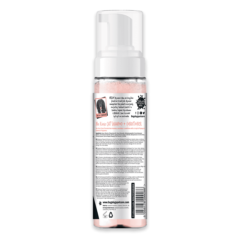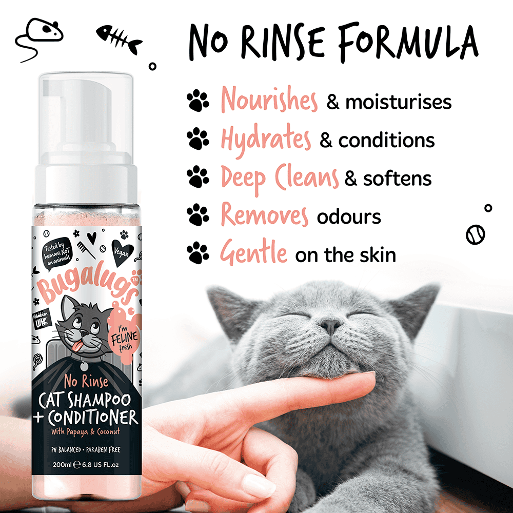 Bugalugs No Rinse Cat Shampoo & Conditioner er pH-balanceret, vegansk og fremstillet i Storbritannien – Den skånsomme formel, beriget med ekstrakt af papaya, er perfekt til alle katte og killinger over 8 uger, inklusive dem med sensitiv hud.