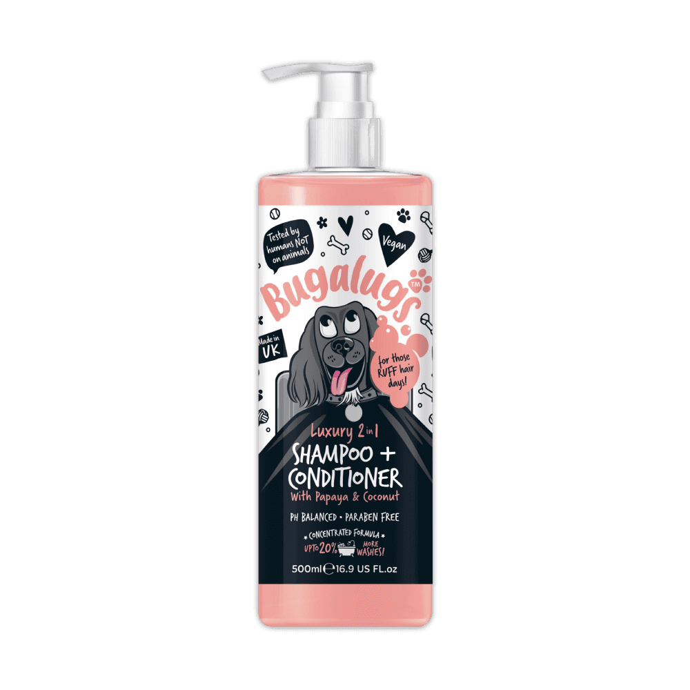 Regelmæssig brug af denne shampoo og balsam gør det lettere at rede filtret pels ud og hjælper med at opretholde en sund glans. Giv din hund en luksuriøs spaoplevelse derhjemme med Bugalugs 2-i-1 shampoo og balsam.