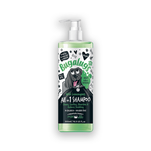 Bugalugs Wild Lemongrass All in 1 Dog Shampoo med fældningskontrol renser, beroliger, nærer og reducerer fældning med en langvarig duft af vild citrongræs.