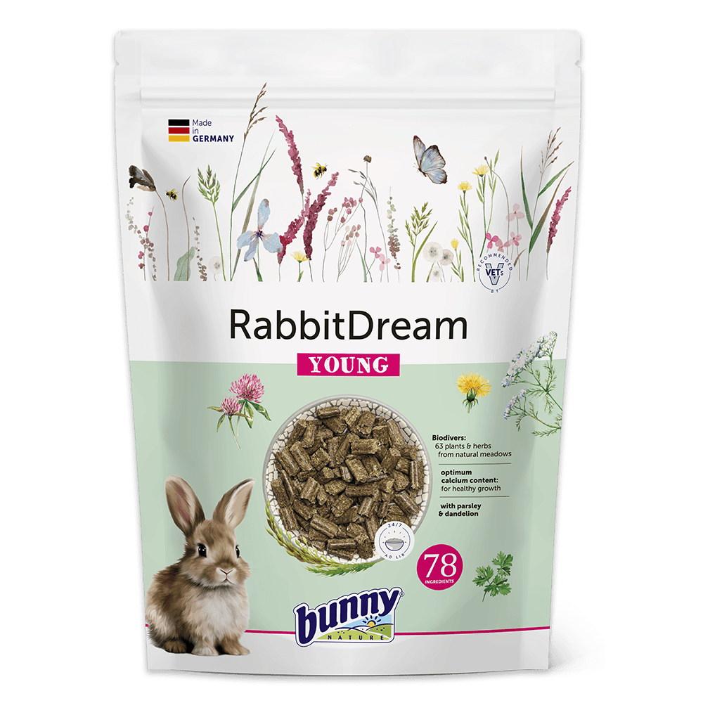 Fyld foderskรฅlen med RabbitDream YOUNG og vent, indtil al maden er spist, fรธr du fylder den igen. Giv altid hรธj kvalitetย af hรธ og frisk, lunken vand dagligt. Nรฅr din kanin nรฅr en alder af 6 mรฅneder, skal du skifte til RabbitDream BASIC eller HERBS.