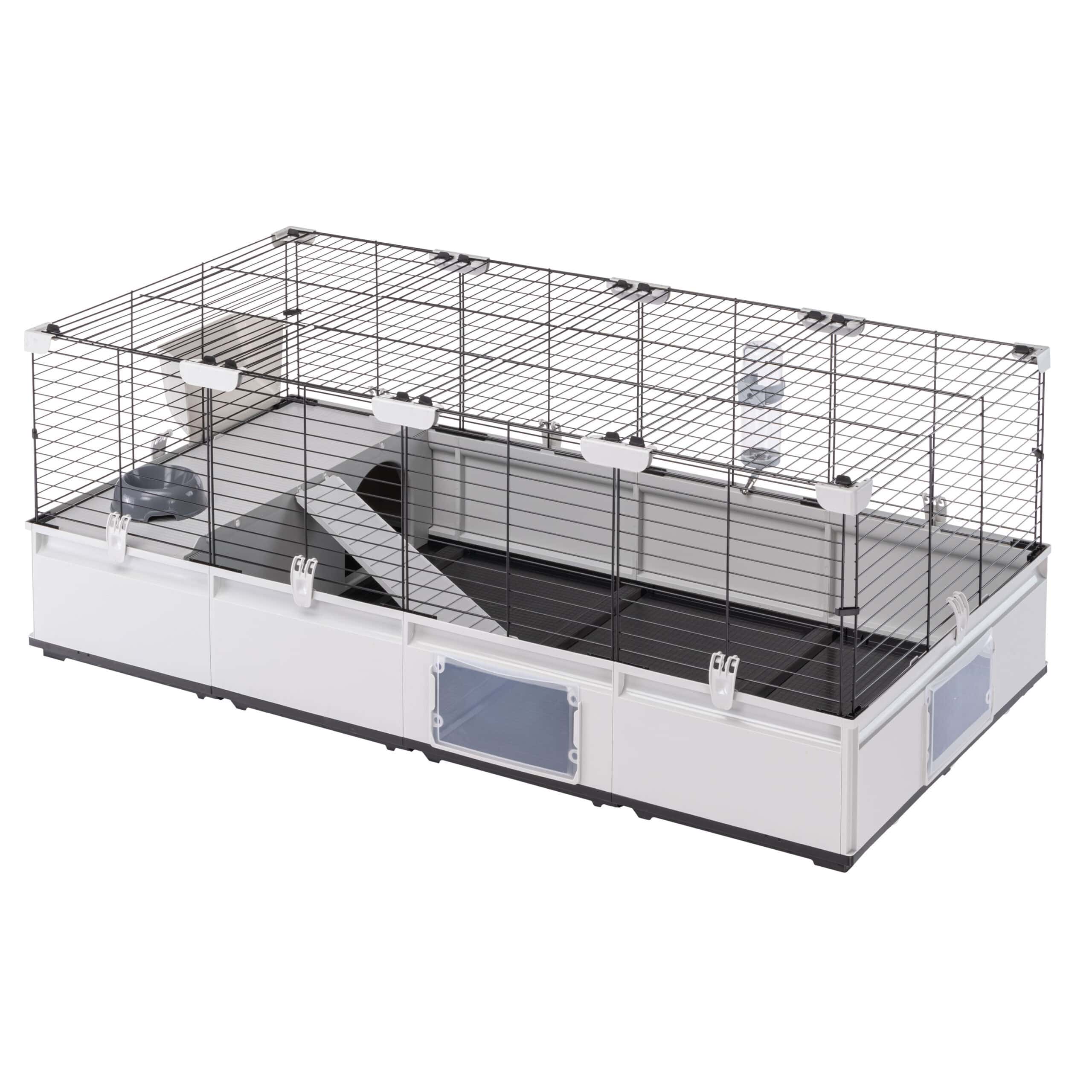 Den er ideel til at huse søde kaniner eller flere marsvin. Denne model leveres komplet med tilbehør såsom en drikkeflaske, madskål, høfoderautomat og stor rede med stige. Endelig giver to praktiske døre dit kæledyr mulighed for at gå ud og udforske det omgivende miljø.