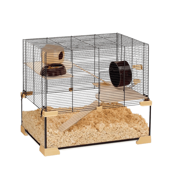 Buret måler 59,5 x 39 x 52,5 cm og er designet med flere niveauer og træhylder, der giver dine kæledyr masser af plads til at bevæge sig frit. Den smarte glasbeholder i bunden forhindrer spild af spåner og giver dig nemt indblik i dit kæledyrs hverdag.