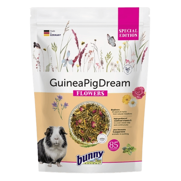 Forkรฆl din marsvin med GuineaPigDream SPECIAL EDITION BLOMSTER โ en eksklusiv blanding, der omdanner hverdagsmรฅltidet til en luksuriรธs oplevelse. Dette foder er skabt med fokus pรฅ aroma og smagsoplevelse, designet til at glรฆde din lille ven.