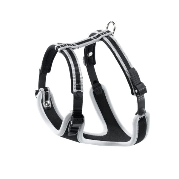 Denne komfortable og brugervenlige hundesele i sølv / sort er designet til mindre hunde og sikrer optimal fordeling af trækkraften på brystet, hvilket skåner halsen.
