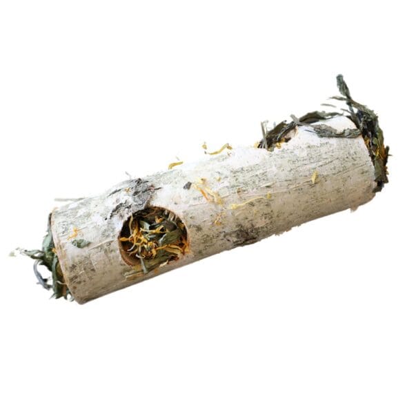 Birkestub med urter som vejbred og morgenfrue kronblade, eller solsikke – perfekt til at slibe tænderne og som aktivering. Stubben er genanvendelig, og kan fyldes igen og igen med forskellige urter.