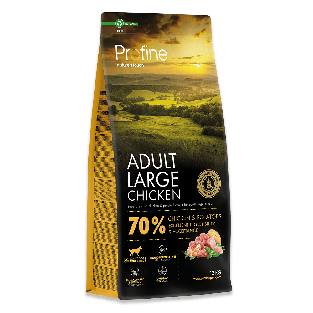 Profine Adult Large Chicken er klart en bestseller, da den har den klassiske indhold af kylling og kartofler. Der er mere kรธd i Profine, end der er i de fleste andre mรฆrker i samme prisklasse.