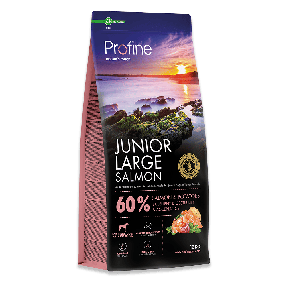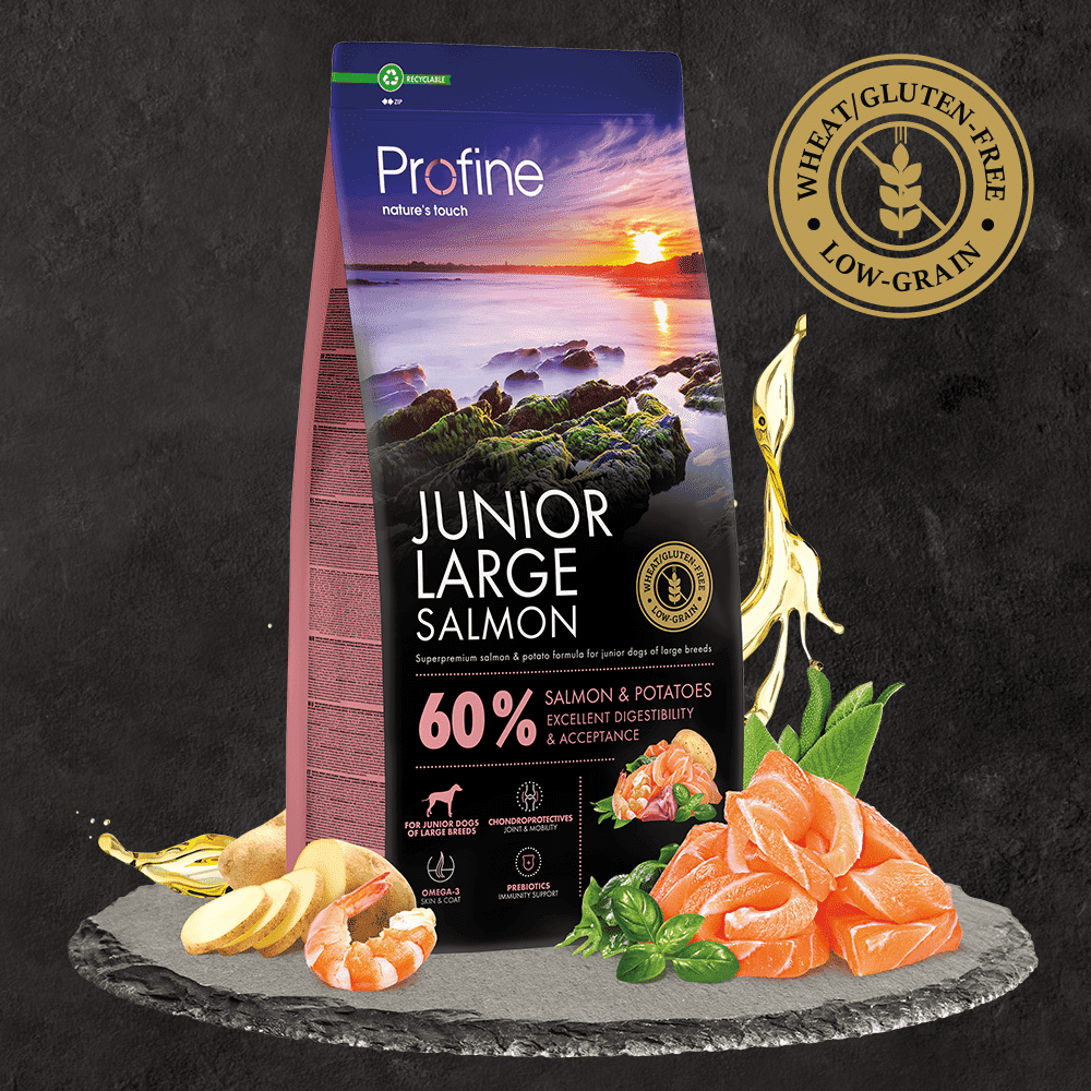 Profine Junior Large Salmon er glutenfrit og helt uden traditionelle kornsorter som havre, hvede, byg og rug. Det er velegnet til hvalpe og unghunde op til 15 mรฅneder.