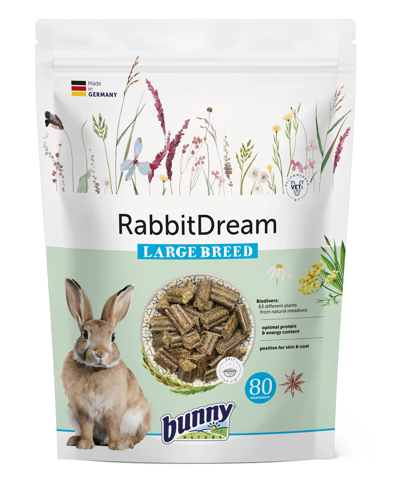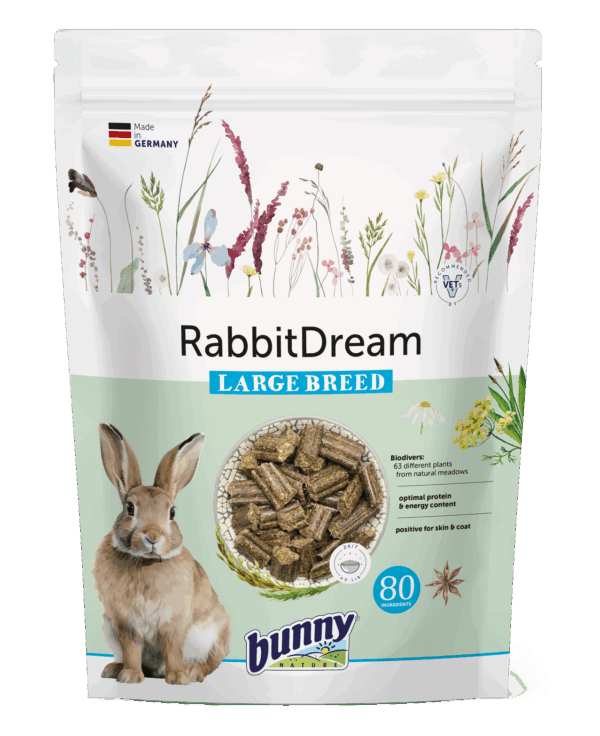 RabbitDream Large Breed 4 kg indeholder 42% råfibre, som bidrager til en god fordøjelse og hjælper din kanin med at holde en normal vægt. Den langvarige tygning, som foderet kræver, er også med til at vedligeholde tænderne. Opskriften er sammensat af 23 naturlige ingredienser, herunder kamille, tagetes og anisfrø, der bidrager til en velfungerende mave. Det giver din kanin en komplet og næringsrig kost, der bidrager til en flot pels.