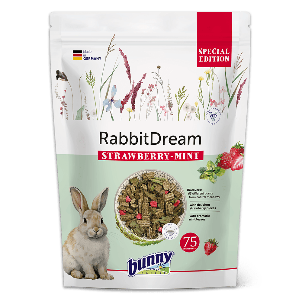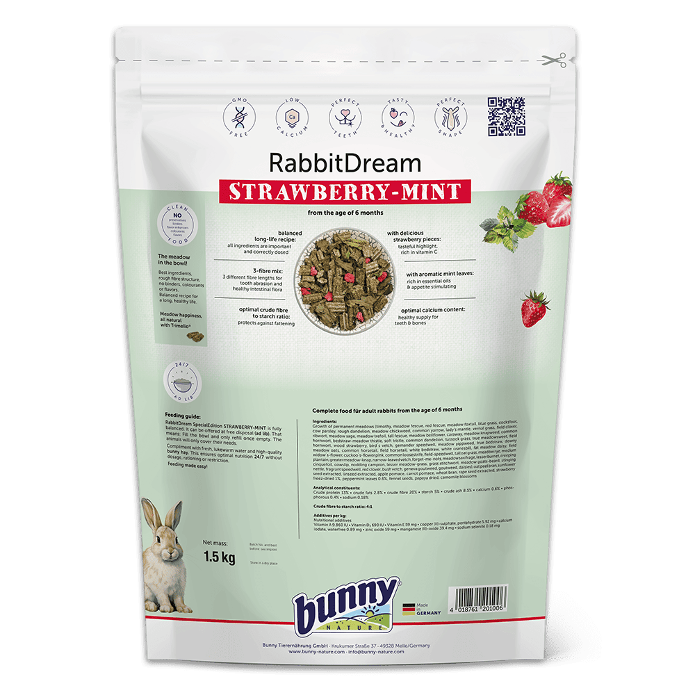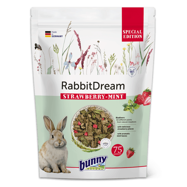 Fodringsanbefaling: RabbitDream SPECIAL EDITION STRAWBERRY-MINT er et fuldt balanceret foder, der kan gives ad libitum. Fyld skålen, lad kaninen spise op, og fyld derefter igen. Kaniner vil kun spise, hvad de har behov for. Sørg altid for at tilbyde frisk, lunkent vand og kvalitets hø for at sikre optimal forsyning døgnet rundt.