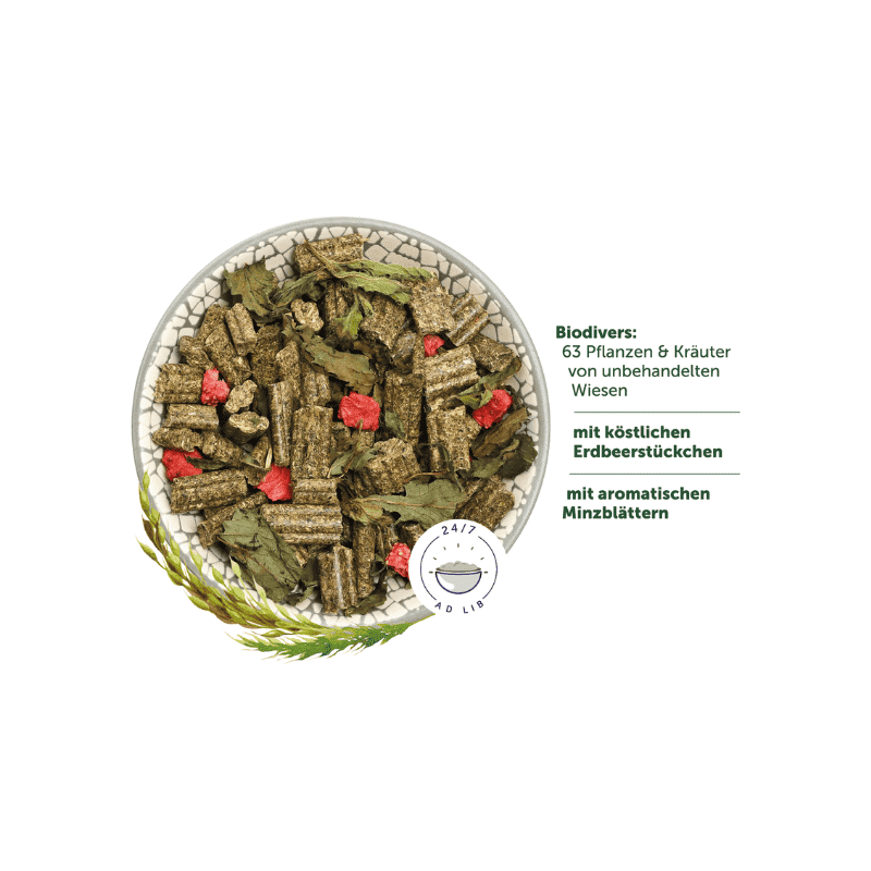 Foderet er biodiverse med 63 planter og urter fra ubehandlede enge, kombineret med frysetørrede jordbærstykker og mynteblade, for at skabe en rigtig lækker smagsoplevelse. De aromatiske mynteblade er rige på æteriske olier og hjælper til at stimulere appetitten. Den balancerede Long-Life-formel sikrer, at alle ingredienser er korrekt doseret, og 3-fiber-mixet med forskellige fiberlængder fremmer tandpleje og en sund fordøjelse. Det optimale råfiber-forhold hjælper med at opretholde idealvægten, mens det balancerede calciumindhold understøtter tænder og knogler.