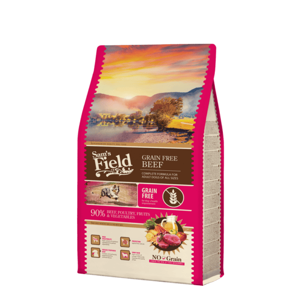 Sam’s Field Grain Free Angus Beef er hundefoder til voksne hunde af alle racer.