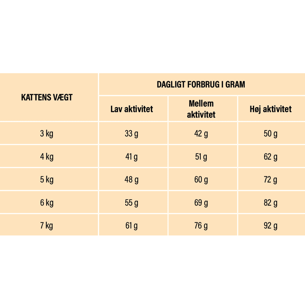 Fodervejledningen er udgangspunkt for fodringen. Hold godt รธje med din kats foderstand og juster op eller ned efter behov.