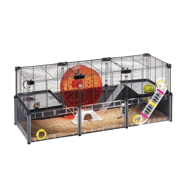 Hamsterburet sikrer en beboelsesplads på 0,52 kvadratmeter fordelt på flere etager, forbundet med stiger, og det kan nemt rumme flere dyr sammen. Produktet er lavet af genbrugsplast og metal, hvor de transparente vægge, sikrer synligheden af gnaverne. Den rummelige og dybe base tillader dyret at grave og gemme sig i savsmuldet.